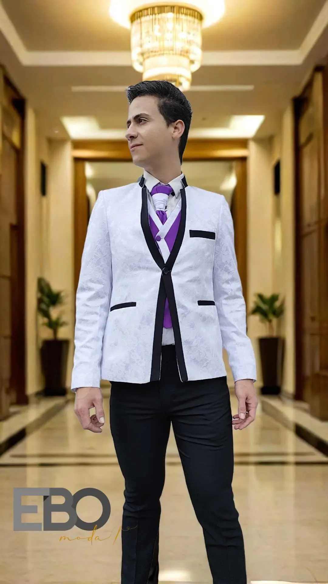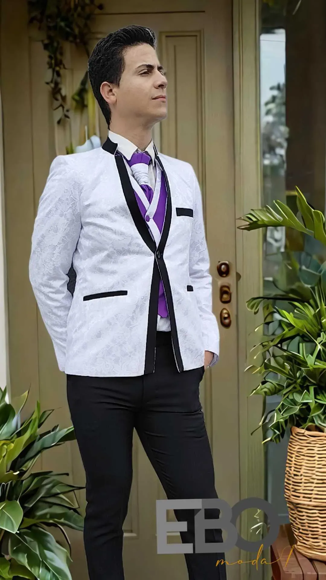 Terno Slim fit, cuello en V, con una abertura en la espalda, 1 boton, con 3 bolsillos. En seda y recubrimiento de tela de encaje texturizada en color blanco, combinado con negro.